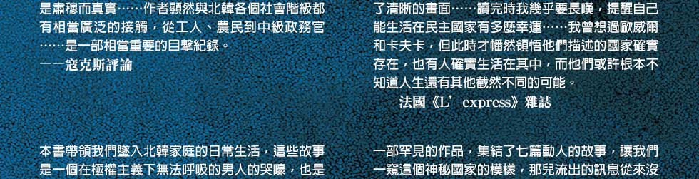 趁著兒子將所有的心思放在玩具上,韓京熙趕緊在每扇窗戶上掛起藍色窗簾。她家位於公寓六樓最前方,屋內所有窗戶分別朝南或朝西。從朝南的窗戶可以看到掛在廣場西邊武力部辦公大樓側牆上的卡爾‧馬克思肖像。從面西的窗戶可以俯瞰掛在廣場主席台後方的金日成肖像,如今絕對不能再讓明植看到這些肖像。但僅僅以先前懸掛的白色尼龍窗簾,根本不可能百分之百遮住它們。不能遮住也就罷了,透過窗簾隱約投射而入的畫像反倒增添一股毛骨悚然的氛圍。對曾經看到近在眼前的馬克思肖像而受驚的明植而言,由於又添加了一股想像力,因此看起來格外恐怖。