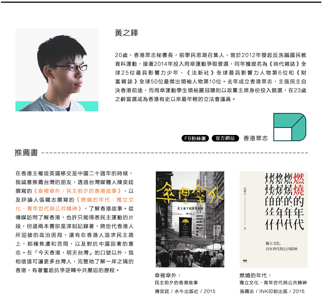 香港人成功證明自己不僅是所謂的經濟動物,而是渴望和嚮往民主、自由、人權和法治的公民。 落實普選遙遙無期,在雨傘運動告終以後,目睹習近平主政下的中國政府視民主、自由、法治和人權如無物,漠視《中英聯合聲明》的承諾,單憑一國兩制能否保障香港高度自治,實在讓人抱有疑問。昔日,香港人面對稱之為「九七大限」的「香港前途問題」,大家相信根據《中英聯合聲明》落實「五十年不變」的「一國兩制」,能夠讓香港邁向民主實現長安治久。如今,「五十年不變」只餘下三十年,一國兩制不斷消逝,甚至已被定性為名存實亡,只讓我們年輕一代,憂心香港在《中英聯合聲明》於二零四七年限期屆滿以後,淪為一國一制的終局。 繼續推動新世代參政和公民抗命的同時,為了把「香港二次前途問題」的討論帶到主流政壇,我便與雨傘運動學生領袖羅冠聰和周庭成立青年政黨「 香港眾志」,主張香港人民根據民主原則透過公投自決定奪《中英聯合聲明》在二零四七年限期屆滿後的香港政治地位和憲法。組黨投入競選的路絕不易走,作為未達法定年齡參選的政黨領袖,只能全心投入羅冠聰的競選工程,最終憑著繼承雨傘運動的信念打動人心,把雨傘精神從街頭帶到議會。年僅二十三歲的羅冠聰成功當選,成為香港史上最年輕的立法會議員,為民主自決的政治路線定下基礎。 二十年前主權移交,沒有香港人認為高中生能夠領導一場佔領運動,亦未曾預料過大學生可以勝任立法會議員一職,更不會想像過一場創造香港歷史的雨傘運動,但至少香港人成功證明自己不僅是所謂的經濟動物,而是渴望和嚮往民主、自由、人權和法治的公民。所以,回想六年前,我在機緣巧合之下投身反國教運動,如今經已全身投入民主運動,在政壇面對更嚴峻的考驗和挑戰,並為著自決運動打拼,實在是一場難忘的旅程。未來的旅程會何去何從,實在不得而知,但在香港「一國兩制」和《中英聯合聲明》只餘下三十年大限之際,我只寄望能夠不忘初衷地抗爭下去,即使面對全世界最大的獨裁政權,民主的路絕不平坦,但我仍希望在二零四七年的時候,當我年屆五十歲的時候,自豪地告訴香港的下一代:過去五十年,我也曾經在我們所出生、成長和所愛的城市裡,為著民主而努力打過美好的仗。 |