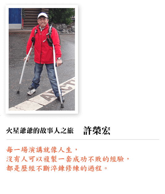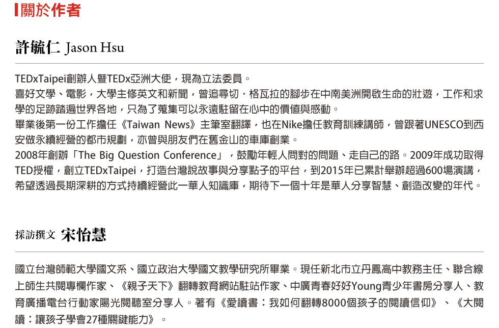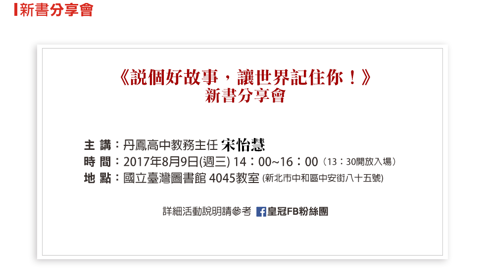 即便做了萬全的準備,到了彩排的時候,麥克風卻還是不給力地出了點問題。陸育克嚴肅地說:「當時迫在眉睫,沒有太多時間思考。只好先放棄用麥克風分享的念頭。因為說故事的歷練,我想起在很多地方,其實是沒有麥克風的,我不是也能駕輕就熟地說好一個又一個的故事嗎?不用麥克風,反而能讓我更即興地以現場表演故事劇的方式,純粹以聲音的情感來表演給大家看或聽。這次的經驗,意外地打開自己未來說故事展演的契機,我不再被場地、設備局限,反而能以舞台表演的方式來說個生動的故事。」 真正到了年會,我發現在這個舞台的感染力和影響力是如此廣大。因而,第一次覺得緊張的情緒困住自己,不過,各個講者的故事都十分動人,因而,我漸漸習慣在說與聽之間的步調,我告訴自己:「故事沒有框架,它可以在床邊、涼亭下、榕樹邊,甚至是TED舞台,Everywhere、Anytime。就是說故事,說一個好故事給台下的觀眾聽,就像當年自己為小小孩說故事一樣。」 一如溝通大師卡曼.蓋洛所說:「好故事是一切溝通的核心價值。不管是兜售構想、傳達理念、爭取選民支持,甚至只是哄小孩睡覺,你的故事絕對是你這輩子最重要的資產。」 會說故事的陸育克,展現莫忘初衷的熱情,找到自己站到舞台的意義是想讓更多人愛聽故事、愛說故事,如此而已的信念,讓我們看見他為說故事打造一個嶄新亮麗的舞台。我相信有人的地方就有故事