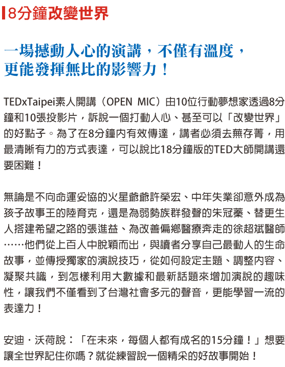 TEDxTaipei是分享不同領域思想與點子的交流平台,也是讓每個素人能自由呈現自己內在價值觀的舞台。同時,希望在短講的時光中,講者與觀眾能透過互動分享相互激勵彼此,在知識的連結與傳遞裡,找到共同夢想的火花。 陸育克看到TED舞台的強大力量,因此,決定用說故事這個議題站上舞台對所有人說故事。只是凡事起頭難,準備期間最大的挫折是,時間太短,要講的素材太多,想在限定的時間內講完,幾乎是不可能的任務,每次練習幾乎都超過時間,其實讓他還滿挫折的。 不過,挫折通常是成長最好的養分,對陸育克來講,最大的收穫是重新對說故事定義、再次爬梳、整理這些年來說故事的歷程與轉折,濃縮、凝鍊自己的人生純度,讓更多人被感動、被激勵。所以,蹲低身子,讓自己回頭檢視自己的說故事歷程,彷彿掉進時光機裡,回憶歷歷在目,重播每個說故事的過程,每個感動的時刻。突然間,他恍然大悟地找到下一步該往哪個方向走,以及繞一條遠路走的意義為何。陸育克輕鬆地說:「我開始不想再介紹自己我是誰,而是分享自己目前正在做些什麼有意義的事情。所以,在OPEN MIC短短的八分鐘時間裡,我整理出講故事的歷程中最有影響力的關鍵點與動人故事。」 如何準備製作一段演講的好內容,以及台上該如何發揮自己最大影響力的事前工夫,看來陸育克已經準備好了。從「OPEN MIC」到TEDxTaipei年會