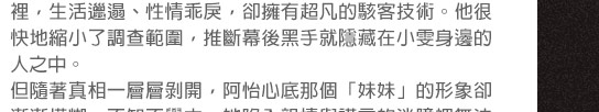 這個認知令阿怡內心一抖,對面前這個不起眼的男人心生畏懼,可是她一轉念,發覺對方正是幫助自己的最佳人選。為了不讓小雯死得不明不白,阿怡按捺住脾氣,硬著頭皮再次提出請求。
