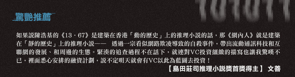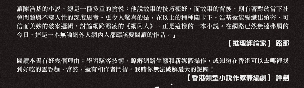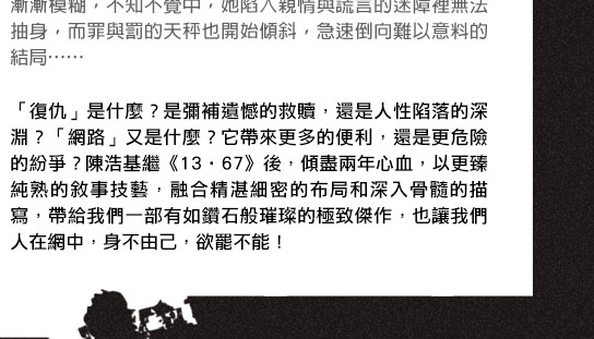 「對,垃圾,無聊、沒意義的垃圾。這種事情每天都發生,人人也因為一點雞毛蒜皮的小事想挖出躲在網路某角落的人來報復,假如我連這種水平的委託也接受,我就比電話公司的客服更不如。莫大毛肯定又感情用事,我明明說過別將狗屎垃圾丟過來,我可不是他的清道夫……」
