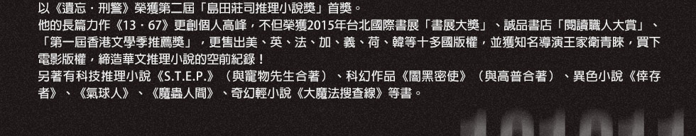 對了!還有阿涅——阿怡猛然想起身旁還有阿涅。阿怡想,既然阿涅是莫偵探推薦的人物,應該遇過不少這種場合,他一定身手不凡,就像李查德筆下的傑克李奇一樣,能拯救自己逃出生天。阿怡回頭望向阿涅,期待看到他跟紋身漢扭打在一起——