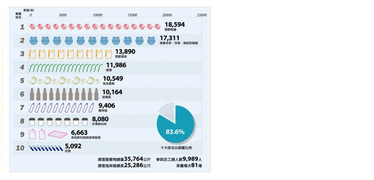 2015年整年度15縣市、48座沙灘、81筆淨灘監測數據顯示,前十大項廢棄物的數量就佔整體廢棄物的83.6%。