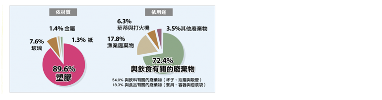 若以材質區分,可發現臺灣海洋廢棄物有89.6%是塑膠製品;以用途切分,則72.4% 與飲食行為相關。