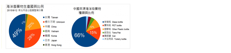 2015年9月12日於新北市金山進行之外來海漂瓶罐調查,顯示不同國籍(左)與中國來源瓶罐容器(右)之數量比例。