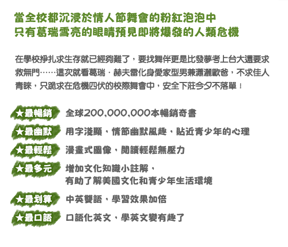 這系列從2007年在美國出版以來即橫掃全球,成為全世界最受歡迎的青少年讀物,最主要的原因除了幽默的劇情,主角的讓人哭笑不得,還有他生活化的語言與生動的插圖,讓許多不愛閱讀的小朋友(reluctant reader),因為葛瑞而重拾閱讀的樂趣。故事中的英文也是「生活化英語」的最佳學習管道,我的孩子與學生們因為閱讀故事中的英文,接觸到教科書中學不到的英語,不但累積許多生活中常用的俚語,自然而然的認識了單字與句型,更透過故事一探美國中學生的校園文化與生活型態。