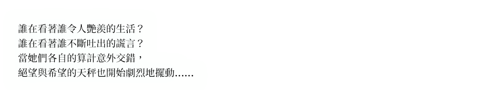 穿透蕾絲窗簾灑進來的光在眼皮上跳動,有些刺眼,卻冷不防蔭成了舒適的暗度,令她倏然睜眼。前一刻窗外還是一片晴朗得惱人的藍天,現在卻被一片詭異的烏雲全面籠罩,在房間投下暗影。下一秒鐘,「嘩」地一陣激烈的雨聲,把千夏子喚回了現實的世界──主婦與母親的世界。如果自己不行動,一切都會停滯不前。