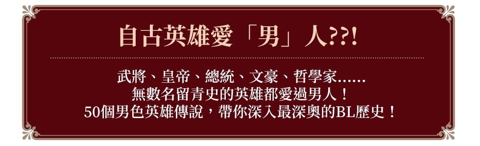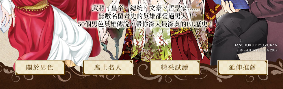 本書收錄50位歷史上的「男色英雄」,除了提供人物介紹、時代背景和有關他們的男色逸話,並全面分析攻受類型,以及領袖魅力、桃花度、知性、富裕度和政治力指數,絕對顛覆你的想像,徹底喚醒你的腐女魂!