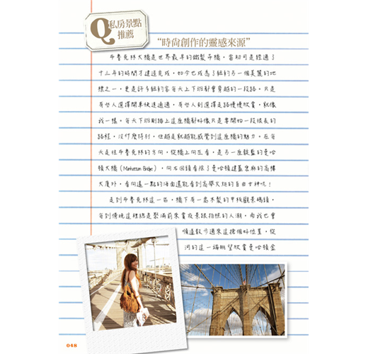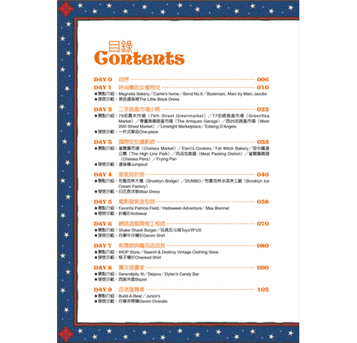舉凡女模特兒喜歡的杯子蛋糕店、跳蚤市場小販推薦的創意市集、電影造型師最私藏的恐怖道具店、圖文插畫家最常光顧的冰巧克力店、攝影師找尋靈感時常去的街拍場景等,從紐約的美食、特色景點等旅遊資訊,到時尚穿搭、整合造型示範,希望藉由旅遊讓所有女生更加享受穿搭的樂趣,並藉由服裝展現出自我生活品味與時尚態度。