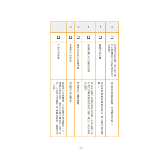 為新進員工舉辦在職訓練時,講師會教授符合商業禮儀交換名片的順序、如何打招呼博取對方的好感、傾聽對方說話時如何回應,以及如何詢問顧客的需求等各種「行為」。