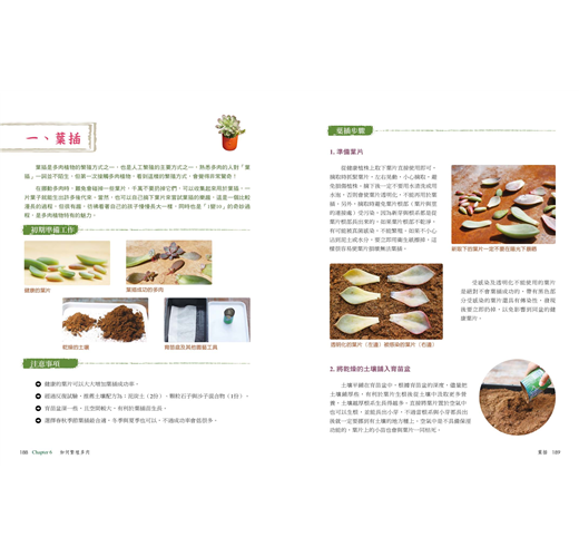 ● 100種多肉植物圖鑑:各種多肉的獨家照護心得與秘訣,如何栽培和組盆最好看,還有依季節所需的澆水、日照需求小圖標,教你如何把多肉都養得健康又漂亮!