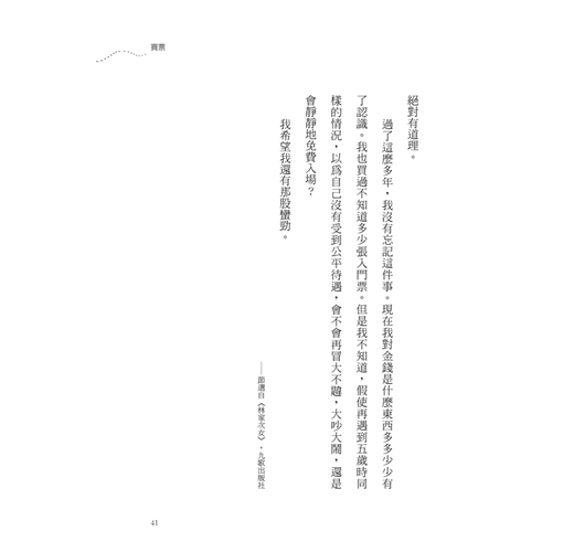 過了這麼多年,我沒有忘記這件事。現在我對金錢是什麼東西多多少少有了認識。我也買過不知道多少張入門票。但是我不知道,假使再遇到五歲時同樣的情況,以為自己沒有受到公平待遇,會不會再冒大不韙,大吵大鬧,還是會靜靜地免費入場?