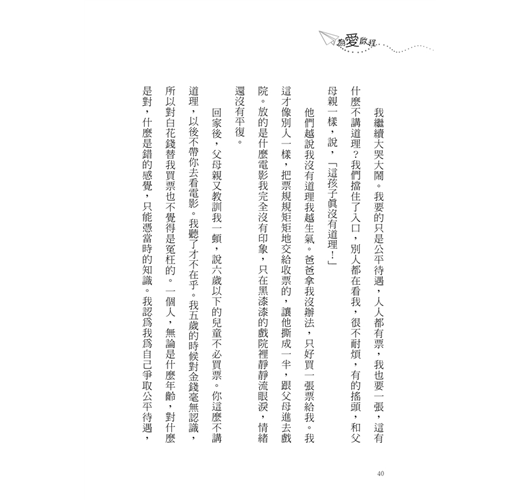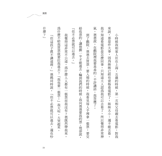 他們越說我沒有道理我越生氣。爸爸拿我沒辦法,只好買一張票給我。我這才像別人一樣,把票規規矩矩地交給收票的,讓他撕成一半,跟父母進去戲院。放的是什麼電影我完全沒有印象,只在黑漆漆的戲院裡靜靜流眼淚,情緒還沒有平復。