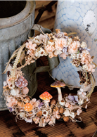 襯上蒐藏已久的歐洲雜貨,油漆剝落以及鐵器生鏽的斑駁感,陳舊的質感彷彿飽經風霜、歷經歲月的洗禮,讓物品有了溫度與質感。搭配上花作,更能呈現出豐富的情境與世界觀。除了在空間中以花點綴,乾燥花與不凋花適合保存數年的特性,也很適合作成配件飾品穿戴,胸針、頭花、手腕花、捧花……點綴出森林系女孩的甜美造型。