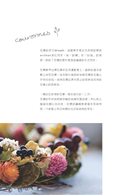因為珍惜花的生命與美麗姿態,而開始製作乾燥花。風味質樸的自然風景,漸漸地在FanFan老師的工作室與作品中,展現它們獨特的個性。因著歲月侵蝕的復古顏色,搭配上人們後天幻化出的不凋花夢幻色彩。亮麗與古樸,彷彿背道而馳的色彩,經由FanFan老師的巧手,融合出一新一舊間、互補而又互相襯托的幻境花色。