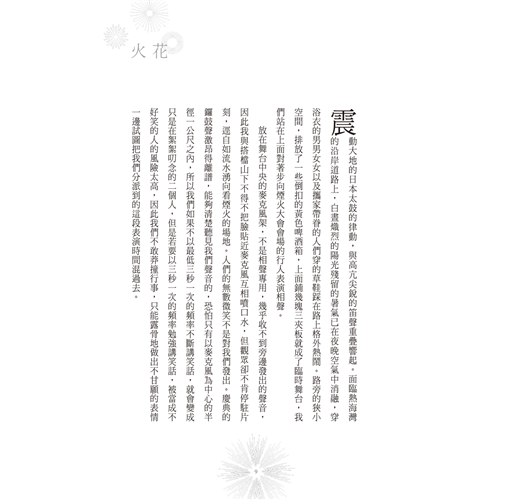 我好奇地朝那個人指的方向一看,站在那裡的是被母親牽著手的小女孩。我在一瞬間感到心痛,拚命祈求他什麼也別說。這若是對我們被安排加入煙火大會的報復,那我希望他就此打住,但那個人堆出滿面笑容,柔聲囁嚅:「是快樂的地獄。」繼而又說:「小妹妹,對不起喔。」光憑這句話,我已經明白這個人有多麼真實。就結果而言,他們的失態比我們更嚴重,結束表演後讓主辦單位的人氣紅了臉,但即便是那時,那個人的搭檔也在瞪視主辦人員、嚇唬對方,那個人還朝我露出孩子似的笑容。那種毫無防備的純真,我真的怕了。