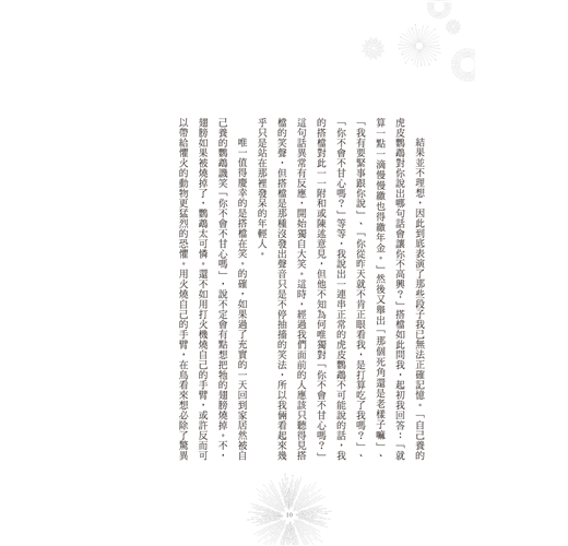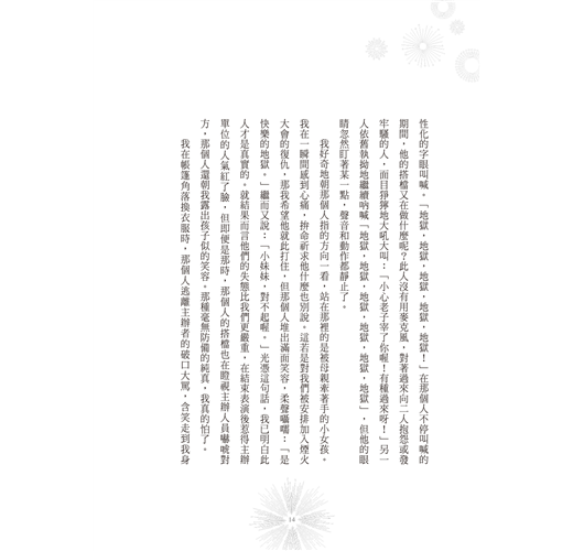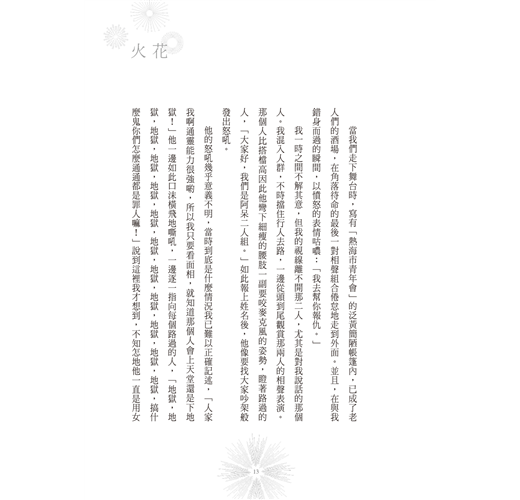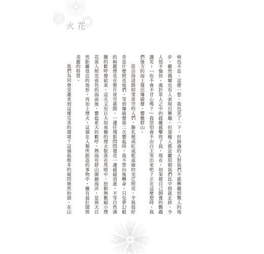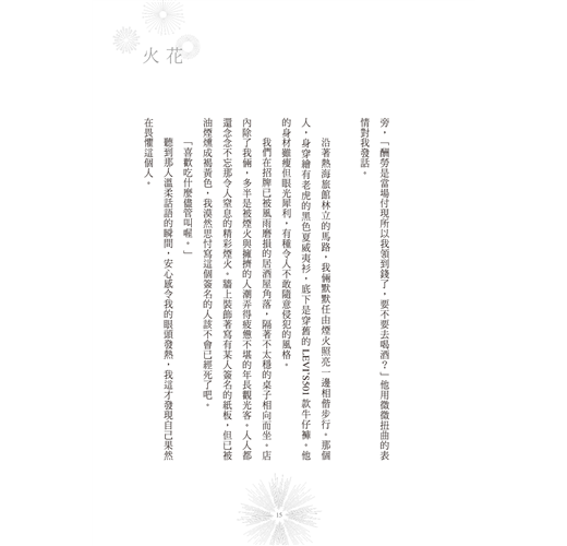光是想到這裡,我便可以體會作者為了攀上這比幸福還要再上一層的階梯,抵達的過程中,如何遇見生命裡重要的人與事,如同黑夜忽地綻放火花,照亮了迷路瞬間。
