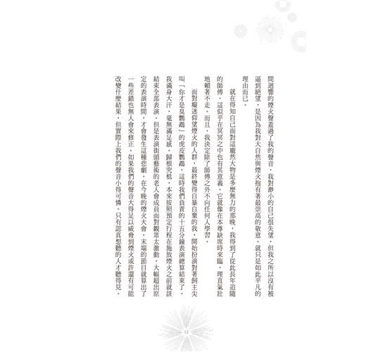 就在得知自己面對這龐然大物是多麼無力的那晚,我擁有了就此長年追隨的師傅,這似乎在冥冥之中也有其意義。煙火就像在師傅來臨前,一個巨大且不能忽視的徵兆。並且,我下了一個決定,從此除了師傅之外不向任何人學習。
