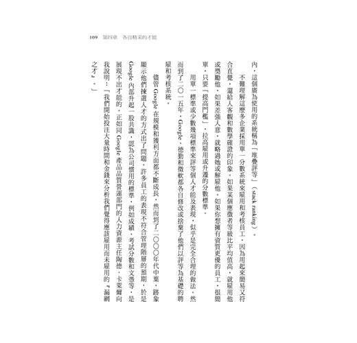在過去社會裡,多數人在詢問他人判斷事物或績效的標準就是及格╱不及格,判斷條件從單一執行╱效率層面到多維度層面至全方位三百六十度績效評估法則的演進,如果在平均值以上似乎較能被接受,平均值以下就必須進入觀察,這在企業、學校教育、個人感情,甚至家庭教育都有可能發生,似乎永遠有辦法標準化評估並分類。從獵人頭顧問的角度來看,若要替企業解決適才適所的議題,部門中就不能都是A咖,必須有不同等級或專業的人組合起來才可能和諧。而這本書定義了不同的評估標準,讓我對於企業用人與求職者之間的矛盾關係有了新的想法。