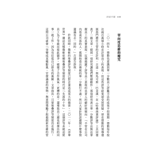 在過去社會裡,多數人在詢問他人判斷事物或績效的標準就是及格╱不及格,判斷條件從單一執行╱效率層面到多維度層面至全方位三百六十度績效評估法則的演進,如果在平均值以上似乎較能被接受,平均值以下就必須進入觀察,這在企業、學校教育、個人感情,甚至家庭教育都有可能發生,似乎永遠有辦法標準化評估並分類。從獵人頭顧問的角度來看,若要替企業解決適才適所的議題,部門中就不能都是A咖,必須有不同等級或專業的人組合起來才可能和諧。而這本書定義了不同的評估標準,讓我...