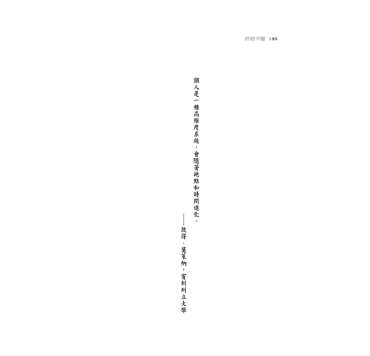 個體都應該跳脫系統及體制思維,因為一旦適應了,就會接受一切的不合理。個體在未來被定義擁有多種角色及特質,而不是過去的一張名片或單一行為定義價值。可能白天是行銷主管,其他時間是個好媽媽,是個鋼琴老師,是個到處旅行的背包客。