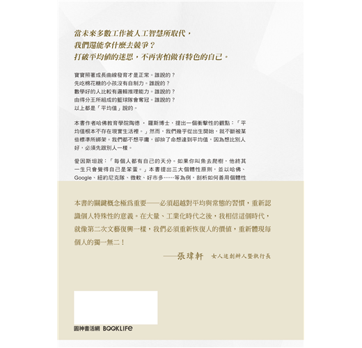 本書作者哈佛教育學院陶德‧羅斯博士,提出一個衝擊性的觀點:「平均值根本不存在現實生活裡。」然而,我們幾乎從出生開始,就不斷被標準給綁架。我們都不想平庸,卻拚了命想達到平均值,因為想比別人好,必須先跟別人一樣。