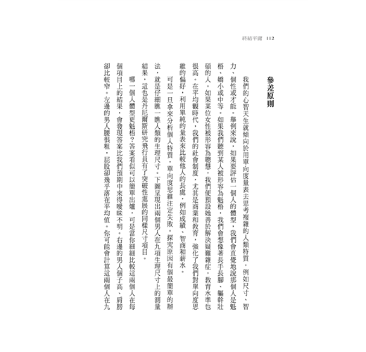 我記得自己讀著這樣的預測結果時,有種萬念俱灰的沮喪。畢竟這些印在工整欄位裡的百分比數字,散發著數學的嚴肅權威性:我感覺單單這一場考試就掂量了我身為人的所有價值,而結果顯示我是很貧乏的。我的初心是以為自己有一天會成為工程師或神經學家,但省省吧,那是多麼愚昧的妄想啊。那場測驗凝重地宣布,我最好習慣當個平均人。