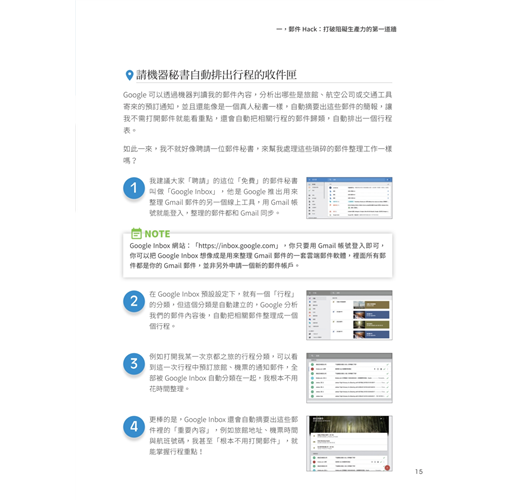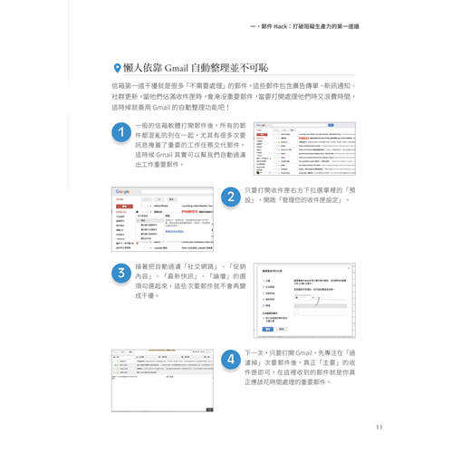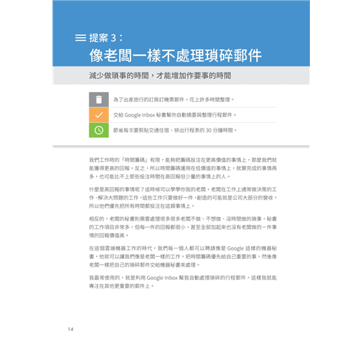 4. 「聰明」工作,優先於努力工作,書中將大量教你如何自動化工作?如何利用 Google 智能系統?如何減少工作步驟?等等你可能從來沒有想過的聰明工作技巧。