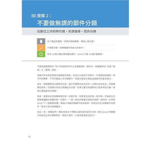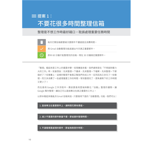 1. 以如何在職場與生活中「節省時間」、「提高效能」的真實案例出發,每一個解決提案會具體告訴你可以節省多少分鐘?加快多少倍速度?