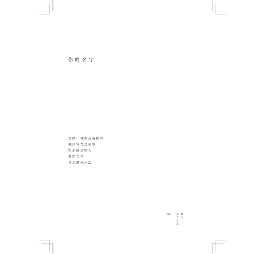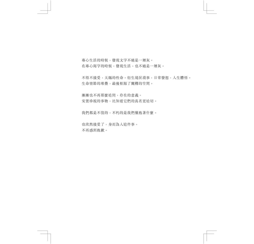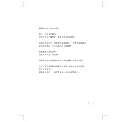 「他說轉化痛苦的方式就是獻身,而我知道獻身其實就是燃燒,忘我地自焚。這樣的燃燒不會有煙塵,也沒有灰燼,只有無盡的灼熱。他說痛苦會產生美麗的晶石,但美麗使我困惑,並更加寂寞。」──任明信