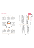 特色4.【清楚的完整圖解】:以生動插畫呈現眼睛細度、耳朵角度等相機拍不出來的細節變化,搭配情境漫畫的解說和真實照片做輔助,用深入淺出的方式讓內容更好懂、版面更豐富!書末附贈貓咪健康檔案,定時替家中毛小孩做紀錄,才能時時掌握最佳的身體狀態。