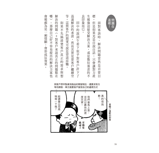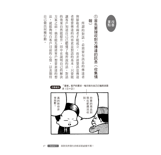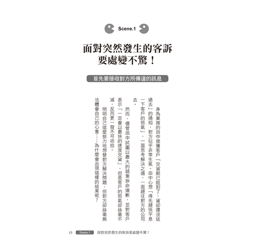 在職場和商業場合,每天都有類似的問題和溝通上的誤會,每個人面對問題都有不同的反應,書中立刻告訴你,首先要發現問題的真正重點,然後提出改善步驟,只要勤加練習,以後遇見類似問題即可迅速正確反應。
