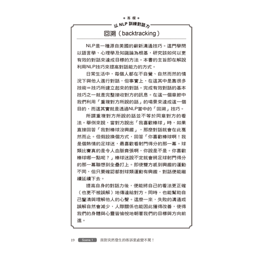 本書運用美國NLP神經語言程式學的說話溝通技巧,這是一套建立於語言學、心理學與邏輯思維基礎的技巧。透過五種感官:眼、耳、鼻、舌、身的視覺圖象、聽覺聲音、觸覺感受、嗅覺氣味、味覺味道,及潛意識來接收外界資訊,在我們的大腦神經系統,轉化成有用資訊的能力。