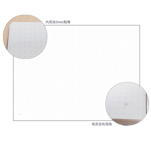 內頁設計採用自由度高的5mm點陣,無論寫字紀錄或是隨意書畫都方便。