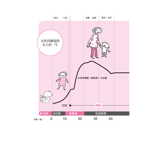 女人和女性荷爾蒙相伴的時間,大約是四十多年。據統計,女性平均壽命約為八十七歲(二○一四年),因此女人一生中幾乎有一半時間,都和女性荷爾蒙生死與共。 有些人誤以為女性荷爾蒙會存在女人身上一輩子,事實上,女性荷爾蒙能協助女人的時間是有限的。相遇,總有離別時。 女人與荷爾蒙,彼此相遇在「青春期」。女性荷爾蒙的分泌量,約自女性七、八歲起,逐漸增加。第一次月經(初經)到來的時間,雖然因人而異,但大約在十二歲左右。女性荷爾蒙的分泌,不會因為月經來而停緩,會持續增加到二十歲前後。女人的身體、外表或心靈,都會因荷爾蒙的增加產生巨大變化,月經來潮和乳房發育等現象,即是最好的例子。不過即便月經來潮,此時的女人仍未發育成熟,不僅子宮大小尚未到達標準,月經也尚未規律,排卵時有時無。這種狀態會隨著女性荷爾蒙的增加,約要經歷十年才逐漸成熟。 二十多歲後,女性荷爾蒙的分泌到達巔峰,進入下一個「性成熟期」階段。這個階段是女性荷爾蒙的黃金時期,不僅經期固定,排卵狀況也很穩定,打造出最適合懷孕生育的生理狀態與環境。此時,女性的外表更處處展現著女人味,柔順光澤的秀髮、吹彈可破的肌膚,以及帶些圓潤的身形。戀愛、結婚與懷孕生育等人生中的重大變化,都在此階段。這個性成熟期約會持續二十年。 緊接著性成熟期之後,是更年期的到來。女性荷爾蒙會逐漸減少,最終連卵巢都會停止分泌荷爾蒙,這會大大改變女性生理機能和身體。畢竟,女性荷爾蒙持續存在了二十年之久,有它相伴已如此理所當然,但是到了這個時期,荷爾蒙卻大量減少,導致身體上、精神上不像先前穩定,容易引起各種不適症狀。 連同月經完全停止的「停經」現象在內,整個更年期將持續十年左右。換句話說,女性會花十年向長年陪伴自己的女性荷爾蒙道別。 自青春期開始一起相互扶持前進,度過性成熟期之後,在更年期別離。這段與女性荷爾蒙一同生活的四十年歲月,看似漫長,其實意外地短暫。