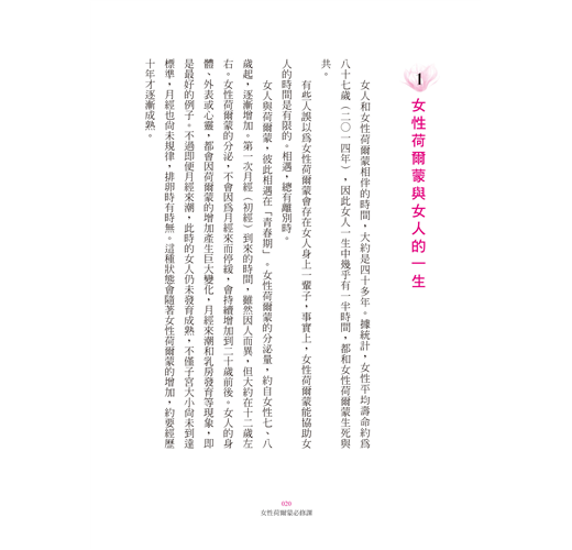 女人和女性荷爾蒙相伴的時間,大約是四十多年。據統計,女性平均壽命約為八十七歲(二○一四年),因此女人一生中幾乎有一半時間,都和女性荷爾蒙生死與共。 有些人誤以為女性荷爾蒙會存在女人身上一輩子,事實上,女性荷爾蒙能協助女人的時間是有限的。相遇,總有離別時。 女人與荷爾蒙,彼此相遇在「青春期」。女性荷爾蒙的分泌量,約自女性七、八歲起,逐漸增加。第一次月經(初經)到來的時間,雖然因人而異,但大約在十二歲左右。女性荷爾蒙的分泌,不會因為月經來而停...