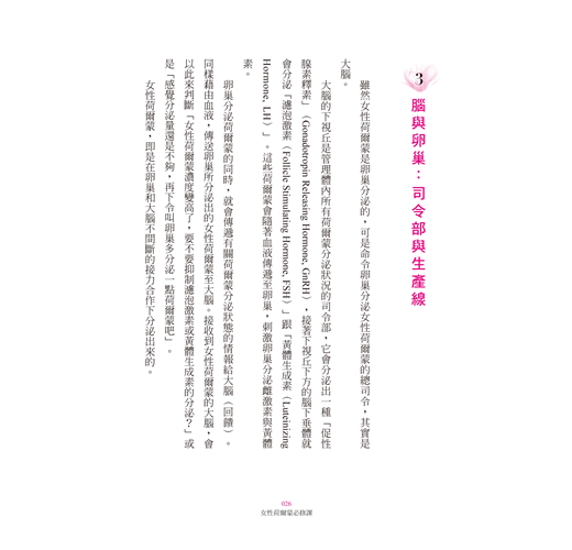 2知性與幹勁都是雌激素的功勞 3女性荷爾蒙的重要工作──月經 4女性荷爾蒙的最大任務──懷孕 5基礎體溫看月經和懷孕 專欄‧看婦科時的實用小技巧 6避孕的各種方法 專欄‧避孕失敗!這時候,72小時內快服用緊急避孕藥 7觀察分泌物,防患性病 8小心!襲擊成年女性的子宮頸癌 專欄‧該接種子宮頸癌疫苗嗎? ◆重點整理 Chapter3小心!女性荷爾蒙偶爾也鬧暴動 1女性荷爾蒙的光和影 2經前煩躁──困擾六成女性的經前症候群 3為什麼會有經前症候群? 4經前症候群,可透過治療改善 專欄‧舒緩經前症候群症狀的草藥 5減輕經前症候群的自我照護法 6嚴重經痛的人,可能患有子宮內膜異位症 7讓女人經痛嚴重的「子宮肌腺症」好發於四十歲 8卵巢囊腫,即使是良性,也輕忽不得 9經血太多好困擾,可能是子宮肌瘤作祟 專欄‧如何判斷經血量是否正常? 10別以為月經不來好輕鬆,可怕的在後頭 專欄‧過度減重或心理壓力,可能造成閉經或亂經 11擺脫亂經、停經的方法 ◆重點整理 Chapter4卵子會老啊 1女人有越來越晚生產的趨勢 2胎兒時期的卵子數最多 專欄‧你還有幾顆卵子?!卵巢年齡可透過檢驗得知 3受孕能力,三十五歲後會驟降 4不孕症的原因 5內診和血液檢查,找出不孕原因 6不孕治療三階段 專欄‧最新療法!讓早發停經的人,也能懷孕! 7高齡生產,對產婦、小孩都危險 專欄‧凍卵真的有用嗎? 8想當媽媽的人不能太瘦 9男女同時治療不孕是最快途徑 10男性不孕的原因?該做哪些檢查呢? 11無精症也能生育! 專欄‧打造易受孕體質!不孕治療,也需要中醫 12想生小孩的人必做的七件事 專欄‧腦瘤也會造成不孕!不過請放心,吃藥就能治好 ◆重點整理 Chapter5女性荷爾蒙終會離開 問卷調查結果告訴你,這才是「更年期的真相」 1停經是更年期的開始 2為何會有更年期? 3一些容易被誤認為更年期的症狀 4八成的女性在更年期時,日常生活不受影響 5哪種人更年期症狀會嚴重? 6月經會在幾歲停止?為何會停? 專欄‧改善更年期亂經的好方法 7停經後,體型跟性生活會出現變化嗎? 8你可能是類更年期症候群 專欄‧一次的抽血檢驗,無法判定出更年期和停經 9兩大療法──荷爾蒙補充療法與中藥療法 10補充女性荷爾蒙,舒緩症狀的療法 11荷爾蒙補充療法,能防止老化,還能預防疾病 12荷爾蒙補充療法,停經五年內開始為佳 專欄‧服用低劑量藥錠的人,到更年期後請換療法 13月經再現的投藥法