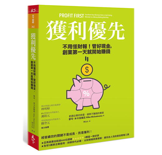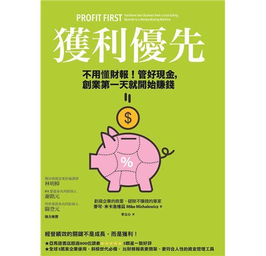 【推薦序】五星級推薦的實用好書 / 林明樟 兩岸跨國企業財報講師 明明做了這麼多金額的生意,公司的銀行帳戶卻常常沒有足夠的現金? 不是因為我們創業者遜,那是因為「人性」! 正常人只要看到收入這麼高,會「誤」以為自己的利潤也這麼多,然後就大手大腳花費過度,在經濟學上,這種需求被稱為「誘發需求」,也就是收入還沒真正變成現金時,創業家已經在自己的腦中設想好如何花掉(投資)這筆錢,然後現金一旦入公司帳後,就直接花掉了。 另一個原因是對自己創業的公司過度樂觀,「誤」以為只要加大投資(金額),就能增加營收,結果過度投資後,營收卻沒有當時想像的樂觀發生。 每個月月底,等財會人員一兩個星期才結算出的公司損益狀況,到了下個月月中才發現原來公司上個月又沒賺錢,於是我們下定決心要好好梳理自己公司的財務狀況,無奈每天都被客戶追著跑(追料、缺貨、品質問題、良率、改規格、出貨……)日復一日,帳單一張接一張,銀行的現金卻一天少過一天,每天的三點半就是惡夢時刻,直到用光最後一塊錢宣布歇業,這就是多數創業者每天拚搏、卻一直無法逃脫的死亡陷阱。 我,自己也創業超過三次,其中兩次就發生上面提到的各種誤區與陷阱。之後的六年,我採用銀行分列專戶方式,將公司收到的現金專款專用,開了16個不同的帳戶,花了數年時間才打造出穩健獲利的創業生涯。 我以為自己傳統的作法只是小技巧,沒想到作者更細緻的運用相同方法,救活了美國三萬家以上的中小企業主,這是一本教您如何「以終為始」:以利潤為最優先,再分配各項費用與支出的實用經營手冊。 書中分享了如何設立七大帳戶(我的手法則是開立了16個帳戶),透過帳戶專款專用,先預留(保留)好合理的獲利金額後,再思考如何合理花費公司營收剩下來的錢,這一個簡單的手法,但卻可以讓您創業的公司快速轉虧為盈。 最核心的思惟就是「銷貨收入-獲利=費用」:公司好不容易收到的現金,要以利潤為中心,剩下的錢(餘額),才是可以花在各項費用上,例如薪資、各項費用、稅款……等。就是因為先保留了利潤,剩下可花用的錢不會太多,我們才會用心用腦將錢花在刀口上(對生意有助益的各項費用上)。 成長只是成功方程式的一半,另一半的祕密就藏在如何管好現金流。 這是一本我會用五星級的高規格推薦的實用好書,希望您也能從中獲益良多,為自己打造一間屬於您的獲利優先企業。 【推薦序】注意費用結構的影響 / 謝銘元 iFit 愛瘦身共同創辦人 一般來說,經營企業都會覺得是:營收–費用=利潤,會以追求營收成長第一優先,正所謂「營收治百病」,只要營收高,就能解決所有的問題。然而這樣的財務目標和結構,常常在不知不覺中讓企業讓陷入危機,當大環境改變,營收不如預期時,費用卻無法快速下降,造成巨大的虧損。 本書提供非常獨特的觀點,就是營收–獲利=費用,也就是以獲利為優先考量,進而去決定各項費用的分配比例,強迫企業主努力增加營運效率,並思考每一筆費用是否花在刀口上。 每次分享創業經驗時,我都會提到一張圖:也就是根據損益表、以時間為橫軸,把公司的營收、毛利、費用、稅後淨利各畫成一條線的折線圖。如果拿最常見的零售店面和電子商務當做例子,當中最不一樣的是固定費用對財務結構造成的影響。 固定費用是指不管營收多少,都一定要支付的費用,最常見的就是店面、辦公室租金。 就以一般實體店面的財務結構為例。開始營業前,租金、裝潢還有人力都要先投入,不論營收成長或是衰退,這些支出都是固定的。隨著營收變好,可能會再增加人力,或開立第二間、第三間店,固定成本隨營收慢慢增加。但當淡季來臨、連續半個月下暴雨、大環境改變,營收銳減,毛利就會同方向衰退,再扣掉費用,可能就賠錢了。 若能控管固定成本,以最極端的例子來說,假設全部成本都成為變動費用,也就是會隨營收連動的費用。當訂單量增加的時候,金流費增加、出貨人力和運費也隨之增加。而營收下滑時,費用也能夠順勢少付一點,對獲利的衝擊相對就會比較小。 當然,經營實務上不大可能把全部的費用都變成變動費用,但盡可能「降固定、升變動」是可以辦到的。實體店面的經營者可以思考,如何透過電商來增加營收,降低固定費用占營收的比例,讓財務結構更有彈性。電商業者在投入實體門市,要特別注意固定費用增加的比例,事先留下能屈能伸的空間。 就像這本書一開始建議的營運調整就是刪減費用一樣,了解營業費用的結構,將是決定經營成功與否的關鍵,我相信這樣做絕對可以幫助你一步一步建立以獲利為優先的財務目標,打造體質更健全的企業。 【推薦序】避開創業者常見的經營盲點【推薦序】 / 關登元 得來素蔬食連鎖共同創辦人 記得在結婚前,我發現自己的戶頭總是存不了什麼錢,也沒什麼在理財,直到結婚後,老婆告訴我需要撥出一些家用、旅遊基金與育兒基金,那時候我就想,我的錢都不夠用了,怎麼可能撥的出來這些錢? 但是在老婆的堅持下,我們還是開了幾個帳戶,然後每個月雙方定期將約定金額轉入,慢慢的開始有了家用、旅遊基金與育兒基金帳戶的錢可以用。 然而,當撥出這些錢之後,當我自己的生活費不夠時,我就要想辦法找出金流來,所以開始接一些邀約課程、寫書、提升公司業績與收入,來增加自己的收入來源。 提這個故事最主