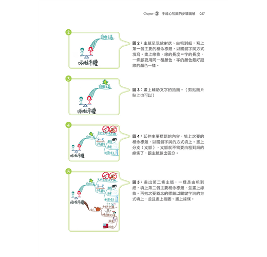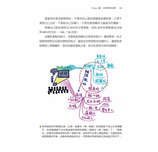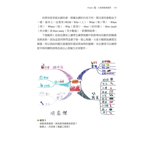作者首先逐步詳細說明繪製一張系統化心智圖所需的準備工作和基本技巧,包含如何挑選適當的筆和紙張、設定構圖的主題、排列的形狀、分支和線條、閱讀的順序、字體的大小;還有色彩的影響、插圖的運用、符號的意涵、關鍵字詞的選擇、層次的安排等。然後針對不同的生活情境使用不同的「心智圖」技巧。