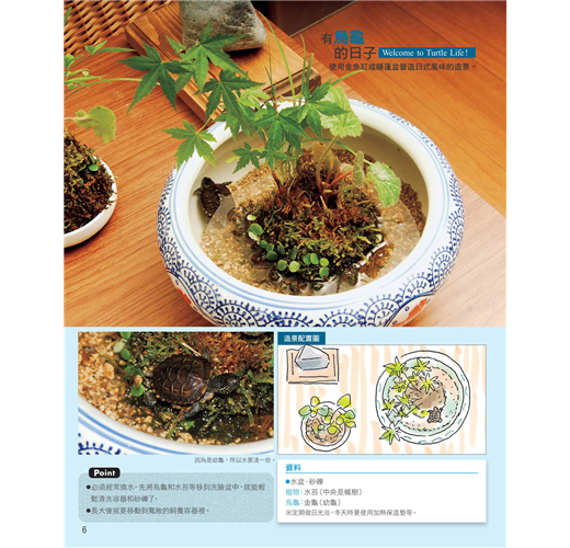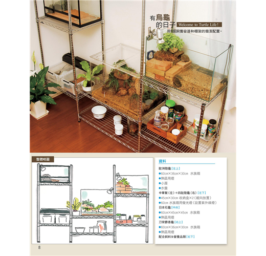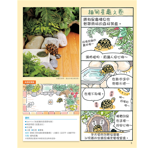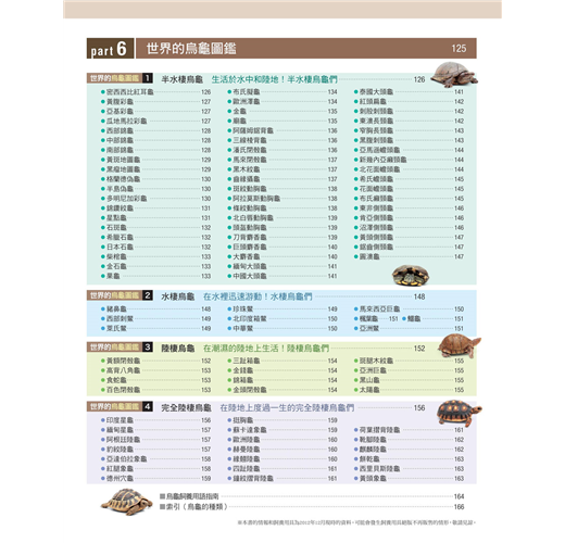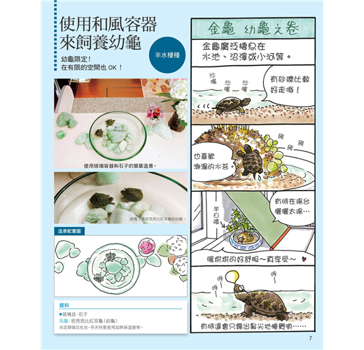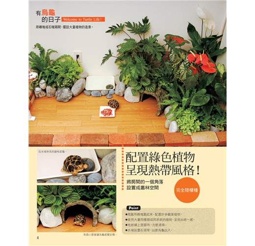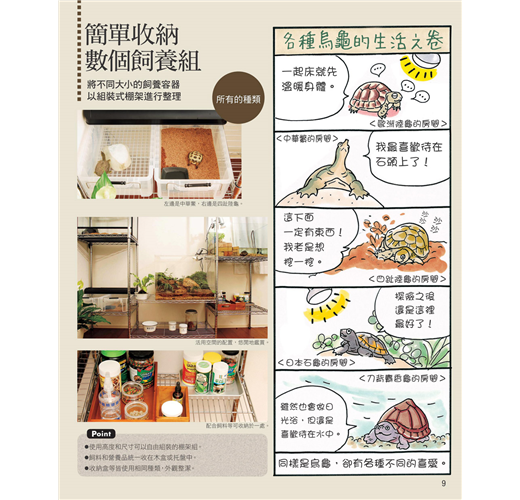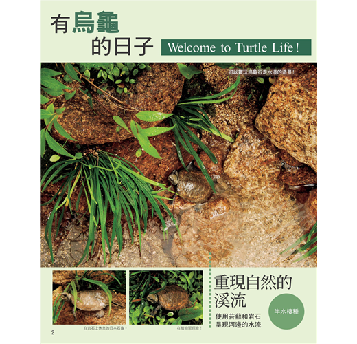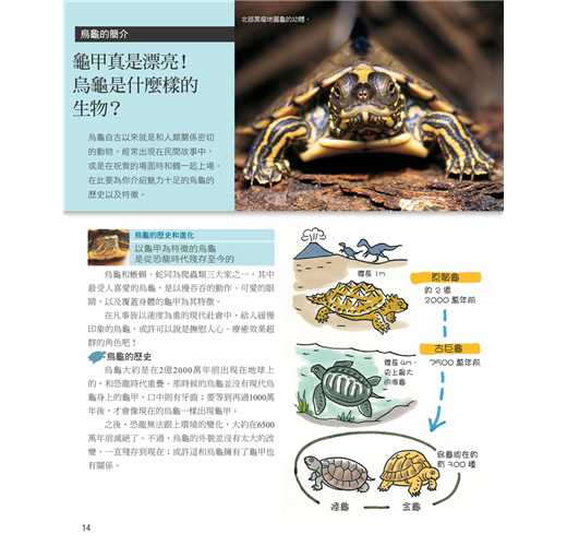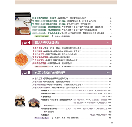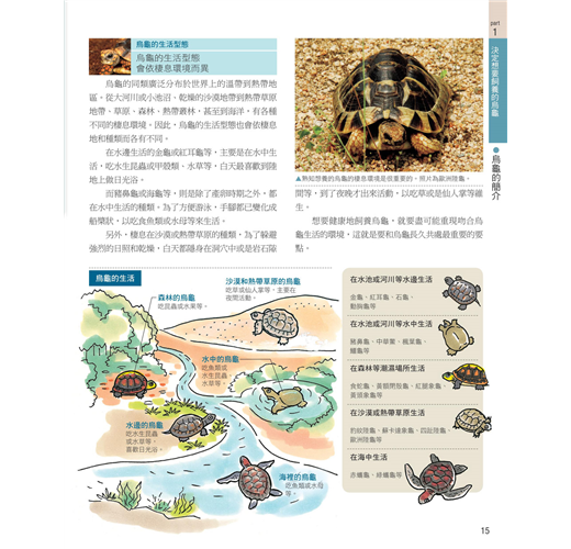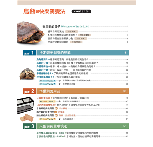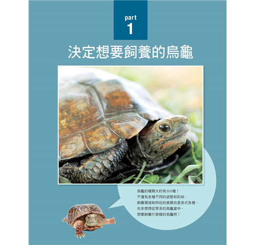 本書除了針對4種族群的烏龜有詳細的介紹,在飼養環境、每日照顧、食餌選擇、休眠繁殖、健康管理上也有淺顯易懂的解說。