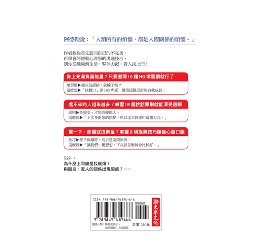 阿德勒說:「人類所有的煩惱,都是人際關係的煩惱。」為了克服這個難題,你得先培養信賴感和同理心,讓自己與對方充滿勇氣,才能跟周遭的人產生美好的互動。