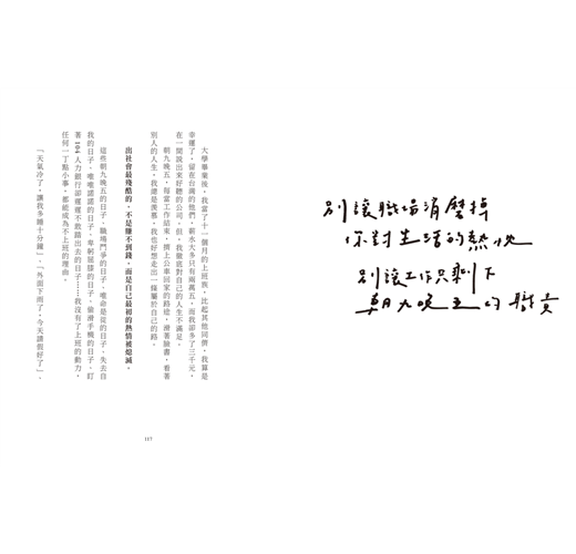「我在職場裡庸庸碌碌,日復一日的工作,消磨了生活的熱忱,只剩下朝九晚五的職責,我常想著,受夠了社會的摧殘,生活好難。 其實,我沒什麼特別的夢想,即使看不見自己的未來,日子過得再爛,我總相信,我一定能有機會『好好生活』。」