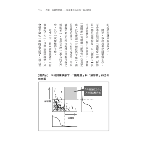 因此,不經思考就悶著頭工作,至少不可能到達「議題度」和「解答質」都很高的境界,以【圖表5】表示這個概念,右上方象限中,橫軸「議題度」和縱軸「解答質」交集之處,就是所謂「有價值的工作」。由於這是百分之一左右的成功率,所以算起來要完全符合的機率只有百分之零點零一,也就是說一萬次的工作中,只有一次像樣的工作。