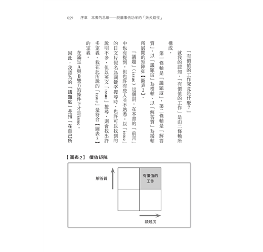 對於矩陣中橫軸「議題度」低的問題,無論多麼努力而拚命擠出解答,終究不能提高其價值,只流於窮忙而已。這種「只要靠努力(勞力)和耐力(蠻力)就能得到回報」的工作方式(自認為「沒功勞也有苦勞」),將永遠無法到達右上方「有價值」的區域。