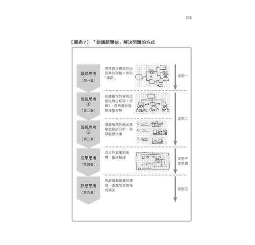 本書從議題思考開始,進而介紹解決問題的全部過程,包括假說思考、成果思考、訊息思考,以及MECE原則(彼此獨立,互無遺漏)、金字塔原理、費米推論等。