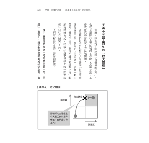 如果真的想要接近右上區域,應該採取的解決方式極其簡單明快。首先,提升橫軸「議題度」,然後提升縱軸「解答質」。也就是採取與「敗犬路徑」相反的取道右邊的解決方式。一開始,鎖定商業與研究活動的對象上徹頭徹尾是有意義的部分,也就是「議題度」高的問題。