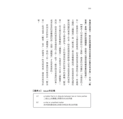 「議題」(issue)這個詞,在本書的「前言」中也有提到,但也許有些人並不熟悉。以「issue」的日文片假名為關鍵字搜尋時,也許可以找到的說明不多,但以英文「issue」搜尋,則會找出許多定義。我在此所說的「issue」是符合【圖表3】的定義。