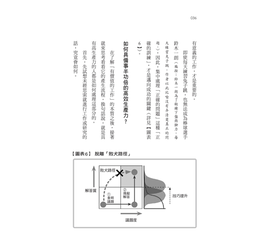 連我也是一樣,二十多歲剛進入職場時,總要工作到頭昏眼花的程度,才有做了工作的感覺,著實白費了相當多的時間。雖說年輕時體力充沛,像那樣的工作方式,也算有讓心情愉快的好處;不過,說穿了,其實也不過是自我陶醉而已,所謂的收穫可能也只是了解到自己體力的極限,成長只有在確實產生出有意義的成果(輸出)之後才能獲得。若能持續有價值的工作,並保持其品質,就算「偷工減料」也完全不成問題。如果是問人可以解決的事,那麼問人就好;如果有比現在更簡單的方法可以完成,就該換個方式處理。