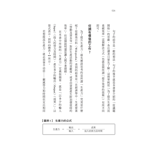 若想提高生產力,就必須事半功倍──刪減勞力和時間但交出相同的成果;或者必須以相同的勞力和時間產出更多的成果。到此為止,相信各位讀者都可以一目瞭然。